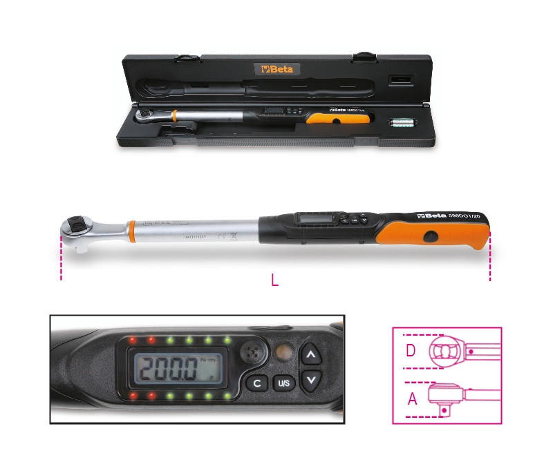 Beta 599DGT/10X elektronikus nyomatékkulcs irányváltós racsnival jobb és bal oldali meghúzáshoz meghúzási pontosság +/- 2% jobb irányban, ± 3% bal irányban 1/2"